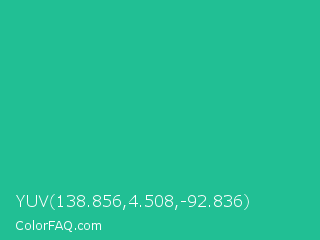 YUV 138.856,4.508,-92.836 Color is a normal cyan color and the nearest color is Mountain Meadow #30ba8f. Hex code #21bf94 and RGB value is rgb(33,191,148). In RGB color space, this color is composed of 13% red, 75% green, 58% blue, In CMYK color space, this color is composed of 83% cyan, 0% magenta, 23% yellow , 25% black , In HSL color space, this color has a hue angle of 164° , 71% saturation and 44% lightness.