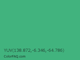 YUV 138.872,-6.346,-64.786 Color is a normal green color and the nearest color is Ocean Green #41aa78. Hex code #41b37e and RGB value is rgb(65,179,126). In RGB color space, this color is composed of 25% red, 70% green, 49% blue, In CMYK color space, this color is composed of 64% cyan, 0% magenta, 30% yellow , 30% black , In HSL color space, this color has a hue angle of 152° , 47% saturation and 48% lightness.