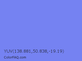 YUV 138.881,50.838,-19.19 Color is a light blue color and the nearest color is Cornflower Blue #6495ed. Hex code #7582f2 and RGB value is rgb(117,130,242). In RGB color space, this color is composed of 46% red, 51% green, 95% blue, In CMYK color space, this color is composed of 52% cyan, 46% magenta, 0% yellow , 5% black , In HSL color space, this color has a hue angle of 234° , 83% saturation and 70% lightness.