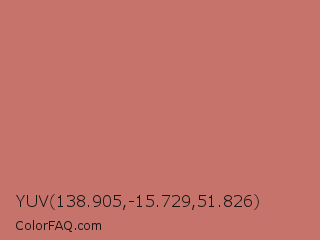 YUV 138.905,-15.729,51.826 Color is a normal red color and the nearest color is Contessa #c6726b. Hex code #c6736b and RGB value is rgb(198,115,107). In RGB color space, this color is composed of 78% red, 45% green, 42% blue, In CMYK color space, this color is composed of 0% cyan, 42% magenta, 46% yellow , 22% black , In HSL color space, this color has a hue angle of 5° , 44% saturation and 60% lightness.
