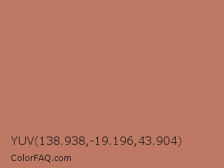 YUV 138.938,-19.196,43.904 Color is a normal red color and the nearest color is Contessa #c6726b. Hex code #bd7964 and RGB value is rgb(189,121,100). In RGB color space, this color is composed of 74% red, 47% green, 39% blue, In CMYK color space, this color is composed of 0% cyan, 36% magenta, 47% yellow , 26% black , In HSL color space, this color has a hue angle of 14° , 40% saturation and 57% lightness.