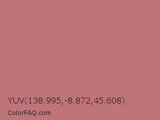 YUV 138.995,-8.872,45.608 Color is a normal red color and the nearest color is Rose Gold #b76e79. Hex code #bf7479 and RGB value is rgb(191,116,121). In RGB color space, this color is composed of 75% red, 45% green, 47% blue, In CMYK color space, this color is composed of 0% cyan, 39% magenta, 37% yellow , 25% black , In HSL color space, this color has a hue angle of 356° , 37% saturation and 60% lightness.