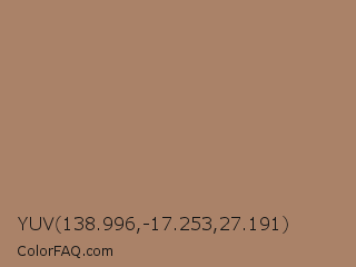 YUV 138.996,-17.253,27.191 Color is a normal orange color and the nearest color is Sandal #aa8d6f. Hex code #aa8268 and RGB value is rgb(170,130,104). In RGB color space, this color is composed of 67% red, 51% green, 41% blue, In CMYK color space, this color is composed of 0% cyan, 24% magenta, 39% yellow , 33% black , In HSL color space, this color has a hue angle of 24° , 28% saturation and 54% lightness.