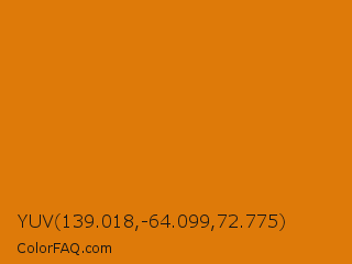 YUV 139.018,-64.099,72.775 Color is a normal orange color and the nearest color is Tahiti Gold #e97c07. Hex code #de7a09 and RGB value is rgb(222,122,9). In RGB color space, this color is composed of 87% red, 48% green, 4% blue, In CMYK color space, this color is composed of 0% cyan, 45% magenta, 96% yellow , 13% black , In HSL color space, this color has a hue angle of 32° , 92% saturation and 45% lightness.