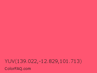 YUV 139.022,-12.829,101.713 Color is a light red color and the nearest color is Fiery Rose #ff5470. Hex code #ff5571 and RGB value is rgb(255,85,113). In RGB color space, this color is composed of 100% red, 33% green, 44% blue, In CMYK color space, this color is composed of 0% cyan, 67% magenta, 56% yellow , 0% black , In HSL color space, this color has a hue angle of 350° , 100% saturation and 67% lightness.