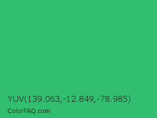 YUV 139.063,-12.849,-78.985 Color is a normal green color and the nearest color is Medium Sea Green #3cb371. Hex code #31be71 and RGB value is rgb(49,190,113). In RGB color space, this color is composed of 19% red, 75% green, 44% blue, In CMYK color space, this color is composed of 74% cyan, 0% magenta, 41% yellow , 25% black , In HSL color space, this color has a hue angle of 147° , 59% saturation and 47% lightness.