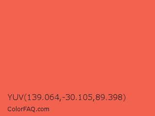 YUV 139.064,-30.105,89.398 Color is a light red color and the nearest color is Sunset Orange #fd5e53. Hex code #f1634e and RGB value is rgb(241,99,78). In RGB color space, this color is composed of 95% red, 39% green, 31% blue, In CMYK color space, this color is composed of 0% cyan, 59% magenta, 68% yellow , 5% black , In HSL color space, this color has a hue angle of 8° , 85% saturation and 63% lightness.