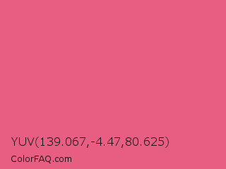 YUV 139.067,-4.47,80.625 Color is a light rose color and the nearest color is Blush #de5d83. Hex code #e75e82 and RGB value is rgb(231,94,130). In RGB color space, this color is composed of 91% red, 37% green, 51% blue, In CMYK color space, this color is composed of 0% cyan, 59% magenta, 44% yellow , 9% black , In HSL color space, this color has a hue angle of 344° , 74% saturation and 64% lightness.