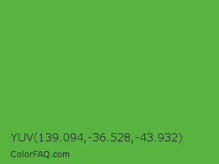 YUV 139.094,-36.528,-43.932 Color is a normal green color and the nearest color is Apple #4fa83d. Hex code #59b341 and RGB value is rgb(89,179,65). In RGB color space, this color is composed of 35% red, 70% green, 25% blue, In CMYK color space, this color is composed of 50% cyan, 0% magenta, 64% yellow , 30% black , In HSL color space, this color has a hue angle of 107° , 47% saturation and 48% lightness.