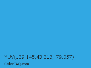 YUV 139.145,43.313,-79.057 Color is a normal blue color and the nearest color is Button Blue #24a0ed. Hex code #31a8e3 and RGB value is rgb(49,168,227). In RGB color space, this color is composed of 19% red, 66% green, 89% blue, In CMYK color space, this color is composed of 78% cyan, 26% magenta, 0% yellow , 11% black , In HSL color space, this color has a hue angle of 200° , 76% saturation and 54% lightness.