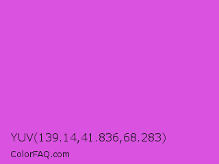 YUV 139.14,41.836,68.283 Color is a normal magenta color and the nearest color is Orchid #da70d6. Hex code #d953e0 and RGB value is rgb(217,83,224). In RGB color space, this color is composed of 85% red, 33% green, 88% blue, In CMYK color space, this color is composed of 3% cyan, 63% magenta, 0% yellow , 12% black , In HSL color space, this color has a hue angle of 297° , 69% saturation and 60% lightness.