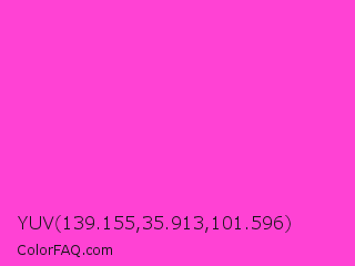 YUV 139.155,35.913,101.596 Color is a light magenta color and the nearest color is Purple Pizzazz #fe4eda. Hex code #ff42d4 and RGB value is rgb(255,66,212). In RGB color space, this color is composed of 100% red, 26% green, 83% blue, In CMYK color space, this color is composed of 0% cyan, 74% magenta, 17% yellow , 0% black , In HSL color space, this color has a hue angle of 314° , 100% saturation and 63% lightness.