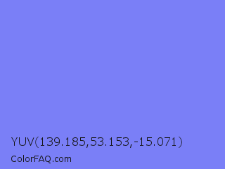 YUV 139.185,53.153,-15.071 Color is a light blue color and the nearest color is Medium Slate Blue #7b68ee. Hex code #7a7ff7 and RGB value is rgb(122,127,247). In RGB color space, this color is composed of 48% red, 50% green, 97% blue, In CMYK color space, this color is composed of 51% cyan, 49% magenta, 0% yellow , 3% black , In HSL color space, this color has a hue angle of 238° , 89% saturation and 72% lightness.