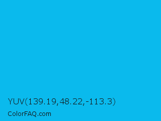YUV 139.19,48.22,-113.3 Color is a normal cyan color and the nearest color is Cyan Process #00b7eb. Hex code #0abaed and RGB value is rgb(10,186,237). In RGB color space, this color is composed of 4% red, 73% green, 93% blue, In CMYK color space, this color is composed of 96% cyan, 22% magenta, 0% yellow , 7% black , In HSL color space, this color has a hue angle of 193° , 92% saturation and 48% lightness.