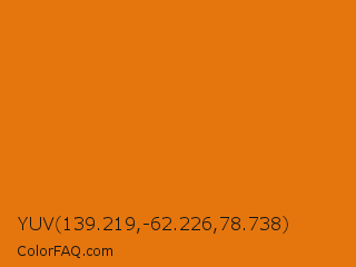 YUV 139.219,-62.226,78.738 Color is a normal orange color and the nearest color is Christine #e7730a. Hex code #e5760d and RGB value is rgb(229,118,13). In RGB color space, this color is composed of 90% red, 46% green, 5% blue, In CMYK color space, this color is composed of 0% cyan, 48% magenta, 94% yellow , 10% black , In HSL color space, this color has a hue angle of 29° , 89% saturation and 47% lightness.
