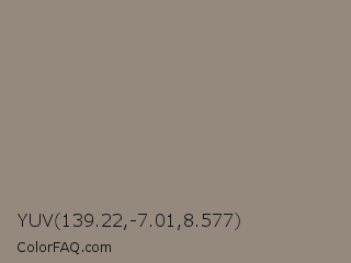 YUV 139.22,-7.01,8.577 Color is a normal orange color and the nearest color is Pale Oyster #988d77. Hex code #95897d and RGB value is rgb(149,137,125). In RGB color space, this color is composed of 58% red, 54% green, 49% blue, In CMYK color space, this color is composed of 0% cyan, 8% magenta, 16% yellow , 42% black , In HSL color space, this color has a hue angle of 30° , 10% saturation and 54% lightness.