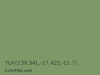YUV 139.341,-17.423,-11.7 Color is a normal green color and the nearest color is Battleship Gray #828f72. Hex code #7e9968 and RGB value is rgb(126,153,104). In RGB color space, this color is composed of 49% red, 60% green, 41% blue, In CMYK color space, this color is composed of 18% cyan, 0% magenta, 32% yellow , 40% black , In HSL color space, this color has a hue angle of 93° , 19% saturation and 50% lightness.