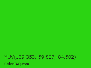YUV 139.353,-59.827,-84.502 Color is a normal green color and the nearest color is Harlequin Green #46cb18. Hex code #2bd412 and RGB value is rgb(43,212,18). In RGB color space, this color is composed of 17% red, 83% green, 7% blue, In CMYK color space, this color is composed of 80% cyan, 0% magenta, 92% yellow , 17% black , In HSL color space, this color has a hue angle of 112° , 84% saturation and 45% lightness.