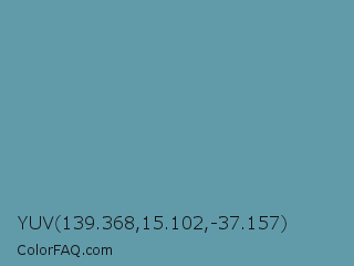 YUV 139.368,15.102,-37.157 Color is a normal cyan color and the nearest color is Hippie Blue #589aaf. Hex code #619baa and RGB value is rgb(97,155,170). In RGB color space, this color is composed of 38% red, 61% green, 67% blue, In CMYK color space, this color is composed of 43% cyan, 9% magenta, 0% yellow , 33% black , In HSL color space, this color has a hue angle of 192° , 30% saturation and 52% lightness.
