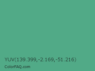YUV 139.399,-2.169,-51.216 Color is a normal green color and the nearest color is Polished Pine #5da493. Hex code #51aa87 and RGB value is rgb(81,170,135). In RGB color space, this color is composed of 32% red, 67% green, 53% blue, In CMYK color space, this color is composed of 52% cyan, 0% magenta, 21% yellow , 33% black , In HSL color space, this color has a hue angle of 156° , 35% saturation and 49% lightness.