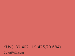 YUV 139.402,-19.425,70.684 Color is a light red color and the nearest color is Sunglo #e16865. Hex code #dc6a64 and RGB value is rgb(220,106,100). In RGB color space, this color is composed of 86% red, 42% green, 39% blue, In CMYK color space, this color is composed of 0% cyan, 52% magenta, 55% yellow , 14% black , In HSL color space, this color has a hue angle of 3° , 63% saturation and 63% lightness.