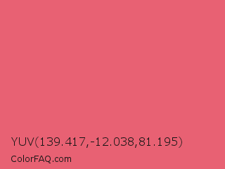 YUV 139.417,-12.038,81.195 Color is a light red color and the nearest color is Light Carmine Pink #e66771. Hex code #e86173 and RGB value is rgb(232,97,115). In RGB color space, this color is composed of 91% red, 38% green, 45% blue, In CMYK color space, this color is composed of 0% cyan, 58% magenta, 50% yellow , 9% black , In HSL color space, this color has a hue angle of 352° , 75% saturation and 65% lightness.