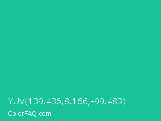 YUV 139.436,8.166,-99.483 Color is a normal cyan color and the nearest color is Light Sea Green #20b2aa. Hex code #1ac29c and RGB value is rgb(26,194,156). In RGB color space, this color is composed of 10% red, 76% green, 61% blue, In CMYK color space, this color is composed of 87% cyan, 0% magenta, 20% yellow , 24% black , In HSL color space, this color has a hue angle of 166° , 76% saturation and 43% lightness.