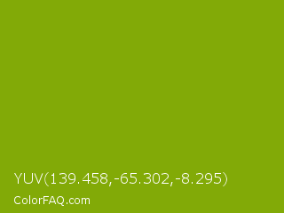 YUV 139.458,-65.302,-8.295 Color is a normal lime color and the nearest color is Apple Green #8db600. Hex code #82aa07 and RGB value is rgb(130,170,7). In RGB color space, this color is composed of 51% red, 67% green, 3% blue, In CMYK color space, this color is composed of 24% cyan, 0% magenta, 96% yellow , 33% black , In HSL color space, this color has a hue angle of 75° , 92% saturation and 35% lightness.