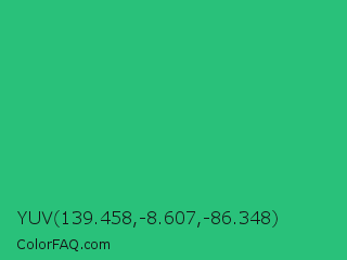 YUV 139.458,-8.607,-86.348 Color is a normal green color and the nearest color is Mountain Meadow #30ba8f. Hex code #29c17a and RGB value is rgb(41,193,122). In RGB color space, this color is composed of 16% red, 76% green, 48% blue, In CMYK color space, this color is composed of 79% cyan, 0% magenta, 37% yellow , 24% black , In HSL color space, this color has a hue angle of 152° , 65% saturation and 46% lightness.
