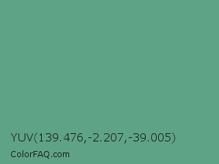 YUV 139.476,-2.207,-39.005 Color is a normal green color and the nearest color is Polished Pine #5da493. Hex code #5fa387 and RGB value is rgb(95,163,135). In RGB color space, this color is composed of 37% red, 64% green, 53% blue, In CMYK color space, this color is composed of 42% cyan, 0% magenta, 17% yellow , 36% black , In HSL color space, this color has a hue angle of 155° , 27% saturation and 51% lightness.