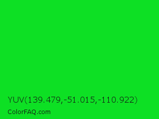 YUV 139.479,-51.015,-110.922 Color is a normal green color and the nearest color is Vivid Malachite #00cc33. Hex code #0de024 and RGB value is rgb(13,224,36). In RGB color space, this color is composed of 5% red, 88% green, 14% blue, In CMYK color space, this color is composed of 94% cyan, 0% magenta, 84% yellow , 12% black , In HSL color space, this color has a hue angle of 127° , 89% saturation and 46% lightness.
