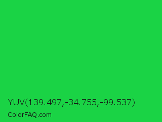 YUV 139.497,-34.755,-99.537 Color is a normal green color and the nearest color is Malachite #0bda51. Hex code #1ad345 and RGB value is rgb(26,211,69). In RGB color space, this color is composed of 10% red, 83% green, 27% blue, In CMYK color space, this color is composed of 88% cyan, 0% magenta, 67% yellow , 17% black , In HSL color space, this color has a hue angle of 134° , 78% saturation and 46% lightness.