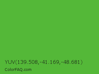 YUV 139.508,-41.169,-48.681 Color is a normal green color and the nearest color is Apple #4fa83d. Hex code #54b838 and RGB value is rgb(84,184,56). In RGB color space, this color is composed of 33% red, 72% green, 22% blue, In CMYK color space, this color is composed of 54% cyan, 0% magenta, 70% yellow , 28% black , In HSL color space, this color has a hue angle of 107° , 53% saturation and 47% lightness.