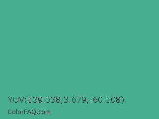YUV 139.538,3.679,-60.108 Color is a normal cyan color and the nearest color is Mint #3eb489. Hex code #47ad93 and RGB value is rgb(71,173,147). In RGB color space, this color is composed of 28% red, 68% green, 58% blue, In CMYK color space, this color is composed of 59% cyan, 0% magenta, 15% yellow , 32% black , In HSL color space, this color has a hue angle of 165° , 42% saturation and 48% lightness.