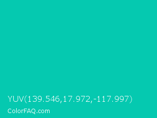 YUV 139.546,17.972,-117.997 Color is a normal cyan color and the nearest color is Amazonite #00c4b0. Hex code #05c9b0 and RGB value is rgb(5,201,176). In RGB color space, this color is composed of 2% red, 79% green, 69% blue, In CMYK color space, this color is composed of 98% cyan, 0% magenta, 12% yellow , 21% black , In HSL color space, this color has a hue angle of 172° , 95% saturation and 40% lightness.