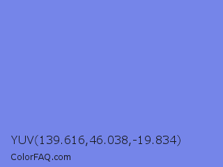 YUV 139.616,46.038,-19.834 Color is a light blue color and the nearest color is Chetwode Blue #8581d9. Hex code #7585e9 and RGB value is rgb(117,133,233). In RGB color space, this color is composed of 46% red, 52% green, 91% blue, In CMYK color space, this color is composed of 50% cyan, 43% magenta, 0% yellow , 9% black , In HSL color space, this color has a hue angle of 232° , 73% saturation and 69% lightness.