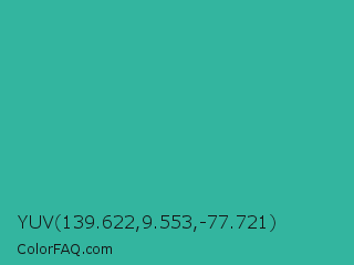 YUV 139.622,9.553,-77.721 Color is a normal cyan color and the nearest color is Keppel #3ab09e. Hex code #33b59f and RGB value is rgb(51,181,159). In RGB color space, this color is composed of 20% red, 71% green, 62% blue, In CMYK color space, this color is composed of 72% cyan, 0% magenta, 12% yellow , 29% black , In HSL color space, this color has a hue angle of 170° , 56% saturation and 45% lightness.