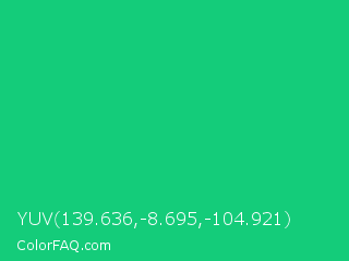 YUV 139.636,-8.695,-104.921 Color is a normal green color and the nearest color is Mountain Meadow Crayola #1ab385. Hex code #14cc7a and RGB value is rgb(20,204,122). In RGB color space, this color is composed of 8% red, 80% green, 48% blue, In CMYK color space, this color is composed of 90% cyan, 0% magenta, 40% yellow , 20% black , In HSL color space, this color has a hue angle of 153° , 82% saturation and 44% lightness.