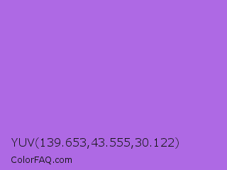 YUV 139.653,43.555,30.122 Color is a light purple color and the nearest color is Rich Lilac #b666d2. Hex code #ae69e4 and RGB value is rgb(174,105,228). In RGB color space, this color is composed of 68% red, 41% green, 89% blue, In CMYK color space, this color is composed of 24% cyan, 54% magenta, 0% yellow , 11% black , In HSL color space, this color has a hue angle of 274° , 69% saturation and 65% lightness.