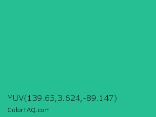 YUV 139.65,3.624,-89.147 Color is a normal green color and the nearest color is Mountain Meadow #30ba8f. Hex code #26be93 and RGB value is rgb(38,190,147). In RGB color space, this color is composed of 15% red, 75% green, 58% blue, In CMYK color space, this color is composed of 80% cyan, 0% magenta, 23% yellow , 25% black , In HSL color space, this color has a hue angle of 163° , 67% saturation and 45% lightness.