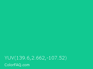 YUV 139.6,2.662,-107.52 Color is a normal green color and the nearest color is Caribbean Green #00cc99. Hex code #11c991 and RGB value is rgb(17,201,145). In RGB color space, this color is composed of 7% red, 79% green, 57% blue, In CMYK color space, this color is composed of 92% cyan, 0% magenta, 28% yellow , 21% black , In HSL color space, this color has a hue angle of 162° , 84% saturation and 43% lightness.