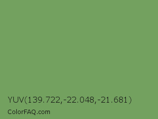 YUV 139.722,-22.048,-21.681 Color is a normal green color and the nearest color is Asparagus Green #7ba05b. Hex code #73a15f and RGB value is rgb(115,161,95). In RGB color space, this color is composed of 45% red, 63% green, 37% blue, In CMYK color space, this color is composed of 29% cyan, 0% magenta, 41% yellow , 37% black , In HSL color space, this color has a hue angle of 102° , 26% saturation and 50% lightness.