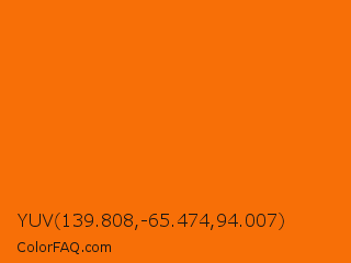 YUV 139.808,-65.474,94.007 Color is a normal orange color and the nearest color is Chilean Fire #f77703. Hex code #f76f07 and RGB value is rgb(247,111,7). In RGB color space, this color is composed of 97% red, 44% green, 3% blue, In CMYK color space, this color is composed of 0% cyan, 55% magenta, 97% yellow , 3% black , In HSL color space, this color has a hue angle of 26° , 94% saturation and 50% lightness.