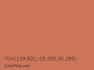 YUV 139.821,-25.055,56.285 Color is a normal color and the nearest color is Copper Red #cb6d51. Hex code #cc7559 and RGB value is rgb(204,117,89). In RGB color space, this color is composed of 80% red, 46% green, 35% blue, In CMYK color space, this color is composed of 0% cyan, 43% magenta, 56% yellow , 20% black , In HSL color space, this color has a hue angle of 15° , 53% saturation and 57% lightness.