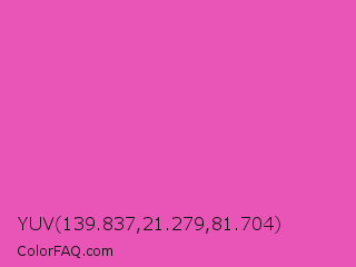 YUV 139.837,21.279,81.704 Color is a light magenta color and the nearest color is Brilliant Rose #f653a6. Hex code #e954b7 and RGB value is rgb(233,84,183). In RGB color space, this color is composed of 91% red, 33% green, 72% blue, In CMYK color space, this color is composed of 0% cyan, 64% magenta, 21% yellow , 9% black , In HSL color space, this color has a hue angle of 320° , 77% saturation and 62% lightness.