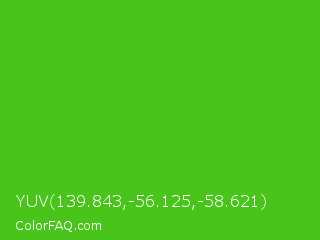 YUV 139.843,-56.125,-58.621 Color is a normal green color and the nearest color is Harlequin Green #46cb18. Hex code #49c41a and RGB value is rgb(73,196,26). In RGB color space, this color is composed of 29% red, 77% green, 10% blue, In CMYK color space, this color is composed of 63% cyan, 0% magenta, 87% yellow , 23% black , In HSL color space, this color has a hue angle of 103° , 77% saturation and 44% lightness.