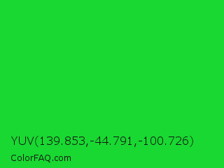 YUV 139.853,-44.791,-100.726 Color is a normal green color and the nearest color is Lime Green #32cd32. Hex code #19d831 and RGB value is rgb(25,216,49). In RGB color space, this color is composed of 10% red, 85% green, 19% blue, In CMYK color space, this color is composed of 88% cyan, 0% magenta, 77% yellow , 15% black , In HSL color space, this color has a hue angle of 128° , 79% saturation and 47% lightness.