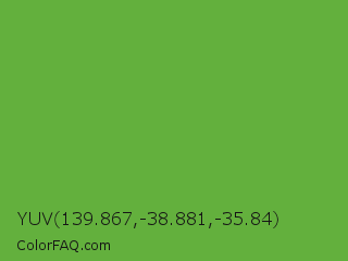 YUV 139.867,-38.881,-35.84 Color is a normal green color and the nearest color is Green RYB #66b032. Hex code #63b03d and RGB value is rgb(99,176,61). In RGB color space, this color is composed of 39% red, 69% green, 24% blue, In CMYK color space, this color is composed of 44% cyan, 0% magenta, 65% yellow , 31% black , In HSL color space, this color has a hue angle of 100° , 49% saturation and 46% lightness.