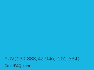 YUV 139.888,42.946,-101.634 Color is a normal cyan color and the nearest color is Battery Charged Blue #1dacd6. Hex code #18b6e3 and RGB value is rgb(24,182,227). In RGB color space, this color is composed of 9% red, 71% green, 89% blue, In CMYK color space, this color is composed of 89% cyan, 20% magenta, 0% yellow , 11% black , In HSL color space, this color has a hue angle of 193° , 81% saturation and 49% lightness.