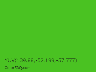 YUV 139.88,-52.199,-57.777 Color is a normal green color and the nearest color is Kelly Green #4cbb17. Hex code #4ac222 and RGB value is rgb(74,194,34). In RGB color space, this color is composed of 29% red, 76% green, 13% blue, In CMYK color space, this color is composed of 62% cyan, 0% magenta, 82% yellow , 24% black , In HSL color space, this color has a hue angle of 105° , 70% saturation and 45% lightness.